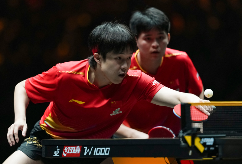 新华社照片,北京,2025年10月4日\n 10月4日,林诗栋/王楚钦(左)在比赛中。\n 当日,在北京举行的2025年世界乒乓球职业大联盟(WTT)中国大满贯赛男子双打决赛中,中国组合林诗栋/王楚钦3比0战胜中国组合周启豪/陈俊菘,获得冠军。\n 新华社记者 孙非 摄