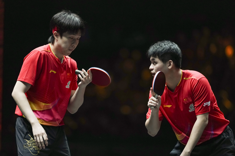 新华社照片,北京,2025年10月4日\n 10月4日,林诗栋/王楚钦(左)在比赛中商讨战术。\n 当日,在北京举行的2025年世界乒乓球职业大联盟(WTT)中国大满贯赛男子双打决赛中,中国组合林诗栋/王楚钦3比0战胜中国组合周启豪/陈俊菘,获得冠军。\n 新华社记者 孙非 摄